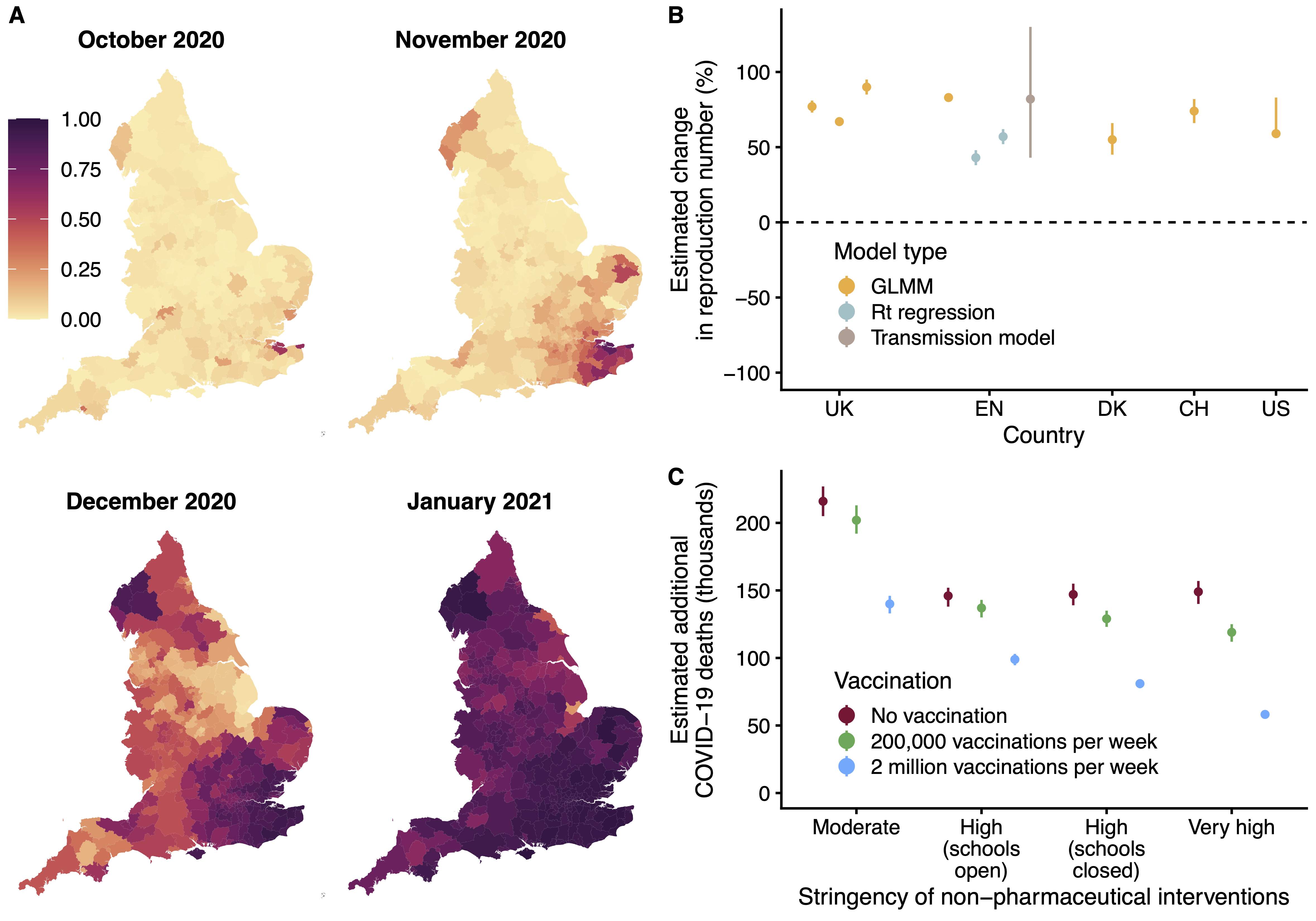 Impact of SARS-CoV-2 Variant of Concern 202012/01. (A) Spread of VOC 202012/01 in England. (B) The estimated relative transmissibility of VOC 202012/01 is similar across the United Kingdom / England, Denmark, Switzerland, and the United States. (C) Projected COVID-19 deaths in England, 15 December 2020–30 June 2021. Vaccine rollout and control measures help mitigate the burden of VOC 202012/01.